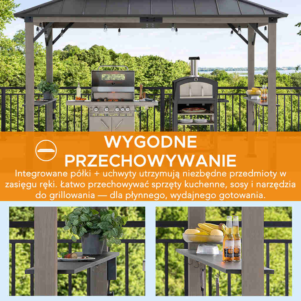 Altana oferuje dużą powierzchnię użytkową, która bez problemu pomieści dwa standardowe grille. Dzięki temu gotowanie staje się wygodne i dobrze zorganizowane. Wbudowane półki oraz haczyki umożliwiają przechowywanie akcesoriów grillowych, naczyń i przypraw w zasięgu ręki. To rozwiązanie, które pozwala skupić się na przyjemności grillowania, a nie na szukaniu potrzebnych dodatków.