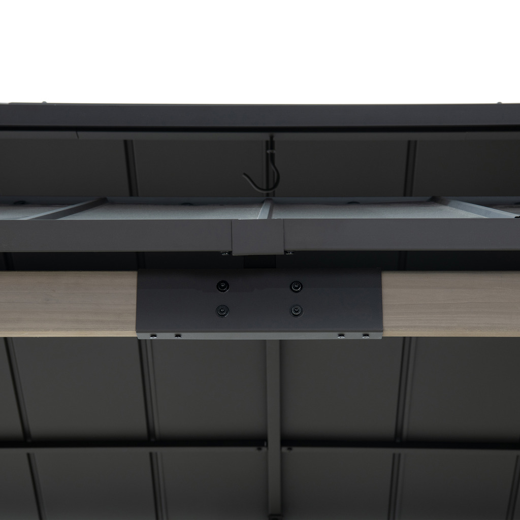 Zintegrowany panel zasilania zwiększa możliwości użytkowe altany. Dwa gniazda elektryczne oraz dwa porty USB umożliwiają podłączenie oświetlenia, wędzarki elektrycznej lub ładowanie urządzeń mobilnych. Organizer kabli pomaga zachować estetykę i porządek w strefie BBQ. Filtr UV na poziomie 99,9% skutecznie chroni przed promieniowaniem słonecznym, co znacząco podnosi komfort użytkowania w ciepłe dni.
