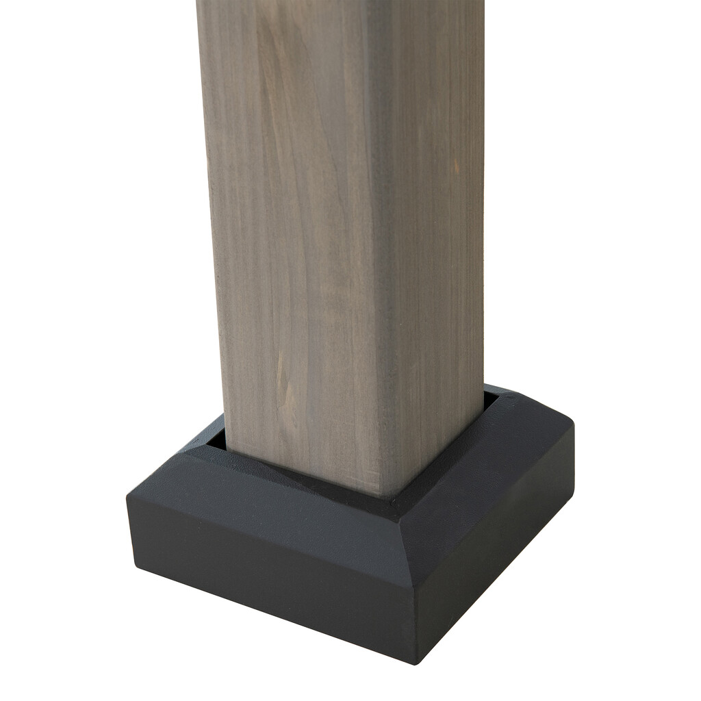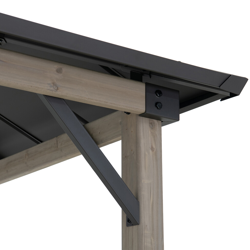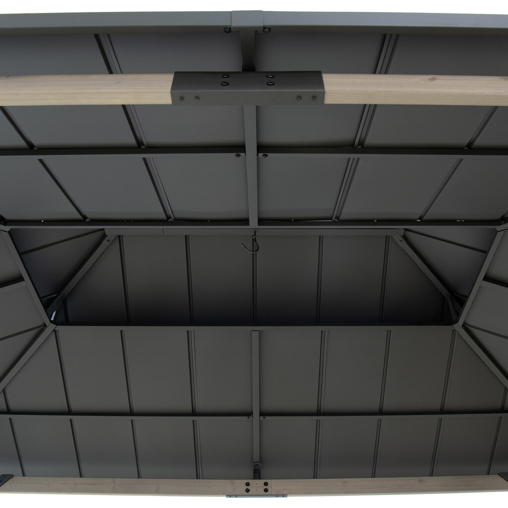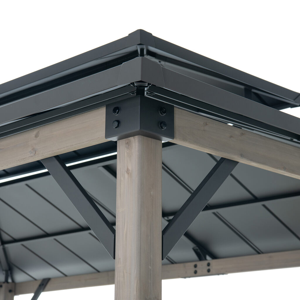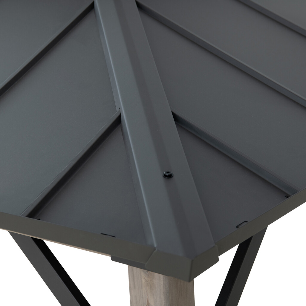 Stalowy dach malowany proszkowo w kolorze antracytu nadaje altanie nowoczesny, elegancki wygląd. Doskonale komponuje się z naturalnym drewnem cedrowym konstrukcji. Dach skutecznie osłania przed opadami i promieniami słonecznymi, a jego wytrzymałość pozwala na obciążenie śniegiem do 110 kg. Skośna forma dachu usprawnia odprowadzanie wody i topniejącego śniegu, zwiększając trwałość całej konstrukcji.