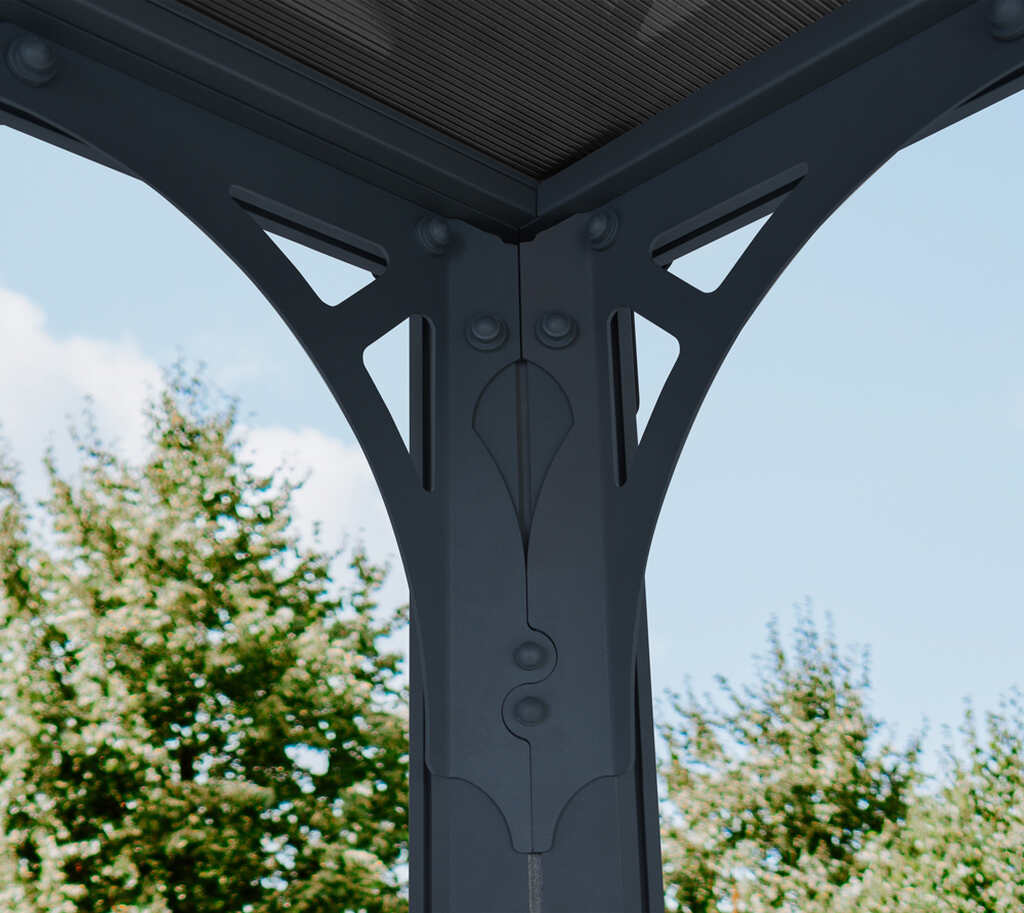 Choć pawilon ma kompaktowe wymiary, jego wytrzymałość nie ustępuje większym modelom. Dach został zaprojektowany tak, by znosić obciążenia śniegiem do 75kg/m2. Stabilne słupy przenoszą ciężar równomiernie, zapewniając bezpieczeństwo nawet zimą.