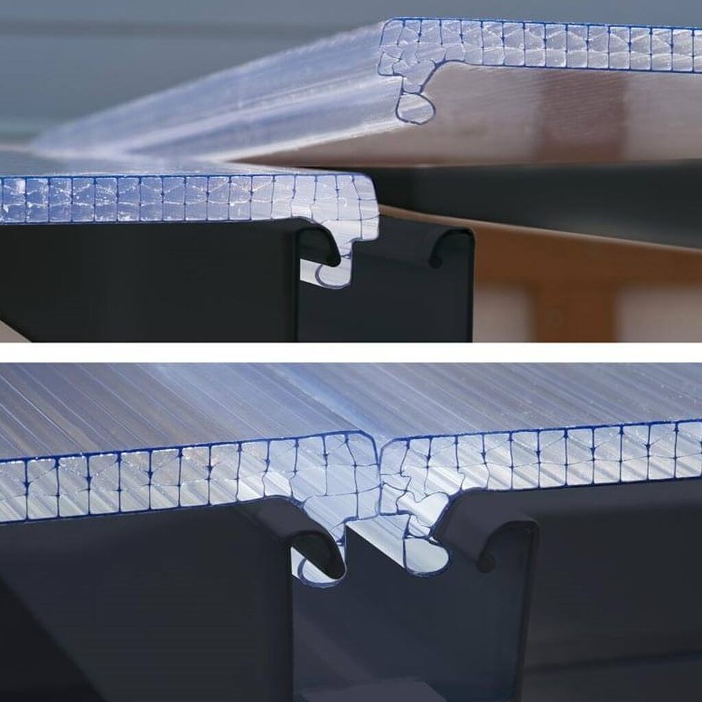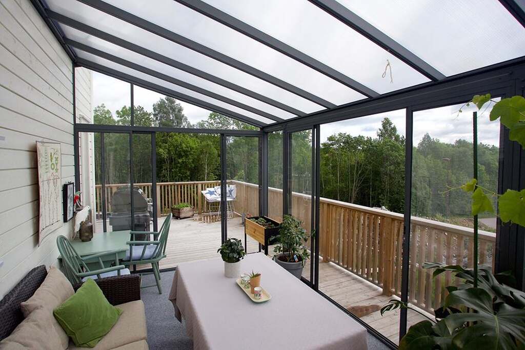 Dach wykonano z 8-milimetrowych płyt poliwęglanowych, które przepuszczają 65% światła. Wnętrze pozostaje jasne i przytulne, a jednocześnie chronione przed nadmiernym promieniowaniem UV. Taka technologia pozwala cieszyć się promieniami słońca bez ryzyka przegrzania.