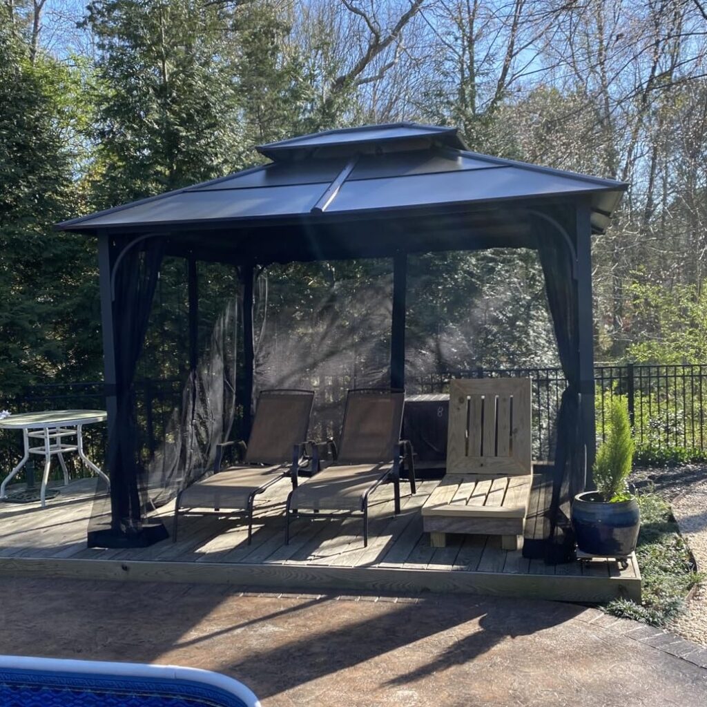 Nie byliśmy pewni, czy jako dwójka 72-latków będziemy w stanie to złożyć. Starannie rozplanowaliśmy sekcje, pracowaliśmy nad nimi po dwie godziny dziennie przez sześć dni i misja została wykonana! Pomocna wskazówka z filmu na YouTube, który obejrzeliśmy: nie dokręcaj całkowicie, aż do zakończenia montażu, a następnie dokręcaj zaczynając od góry, kierując się w dół. Cieszymy się naszą nową altaną!