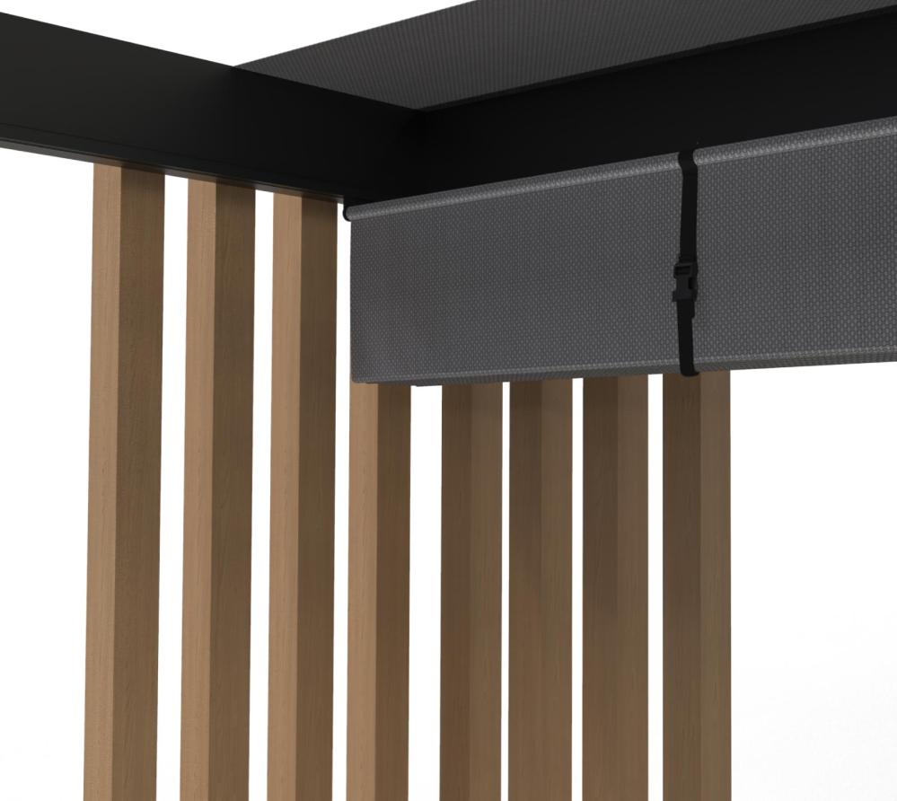 Nowoczesna forma pergoli wyróżnia się na tle innych konstrukcji. Dodatkowe dekoracyjne słupy o wymiarach 7,6 x 7,6 cm nadają jej charakterystyczny wygląd. Połączenie kolorów czarny, szary oraz jasna imitacja drewna tworzy elegancki efekt wizualny. Dzięki temu pergola pasuje zarówno do nowoczesnych, jak i klasycznych aranżacji. To nie tylko zadaszenie. To element, który buduje klimat całej przestrzeni.