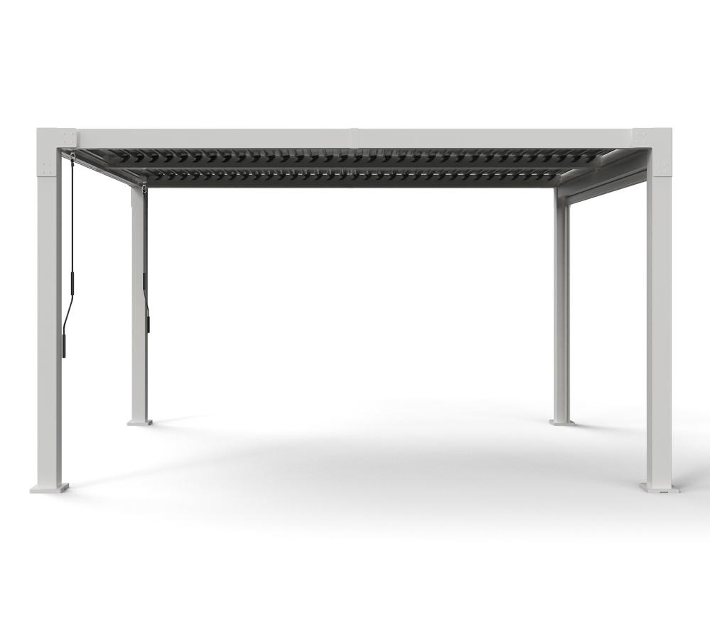 Największą zaletą jest dach z lamelami, który daje pełną kontrolę nad światłem. Pergola posiada dwie niezależne sekcje lameli, które możesz regulować osobno. Dzięki temu dostosujesz zacienienie do każdej pory dnia.
