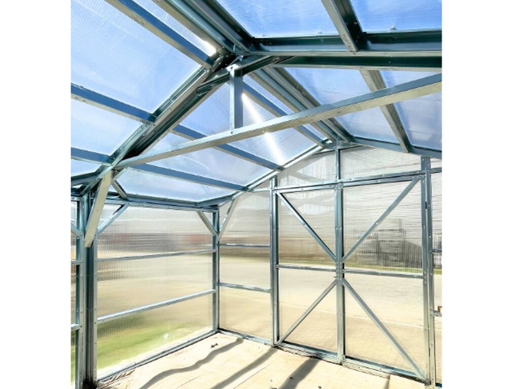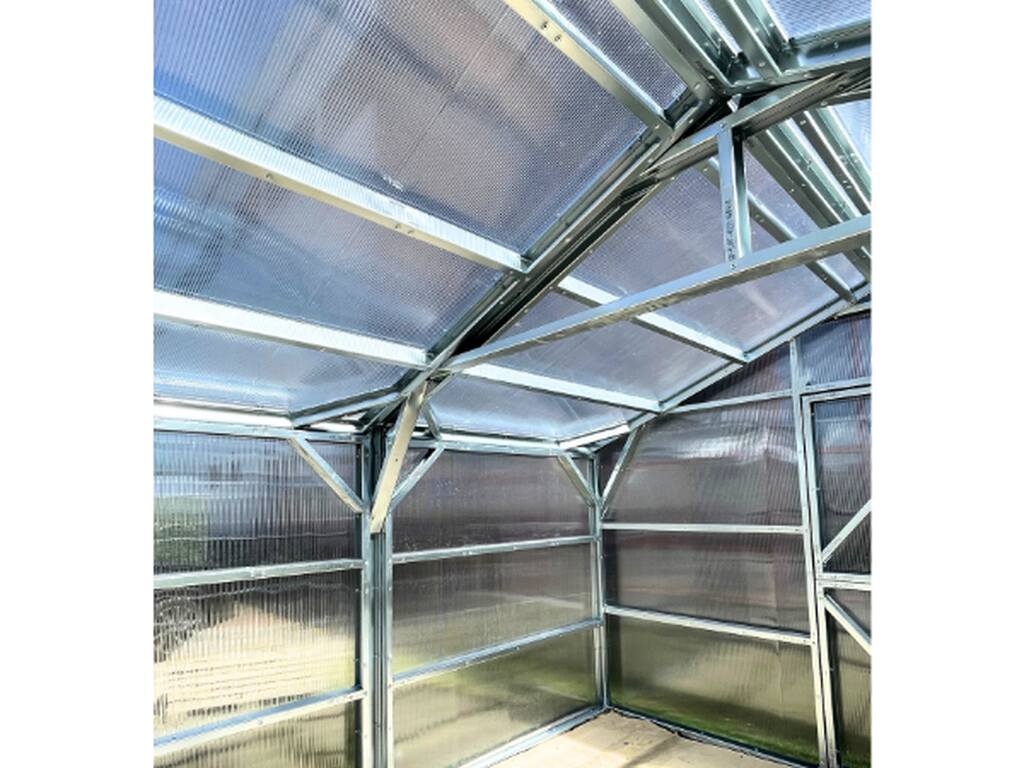 Pokrycie szklarni wykonano z poliwęglanu wielokomorowego 10 mm o gęstości 1,5 kg/m². To materiał stworzony do wymagających warunków. Jego sześciokanałowa struktura przypomina delikatny „pajączek”, który zatrzymuje powietrze między warstwami.