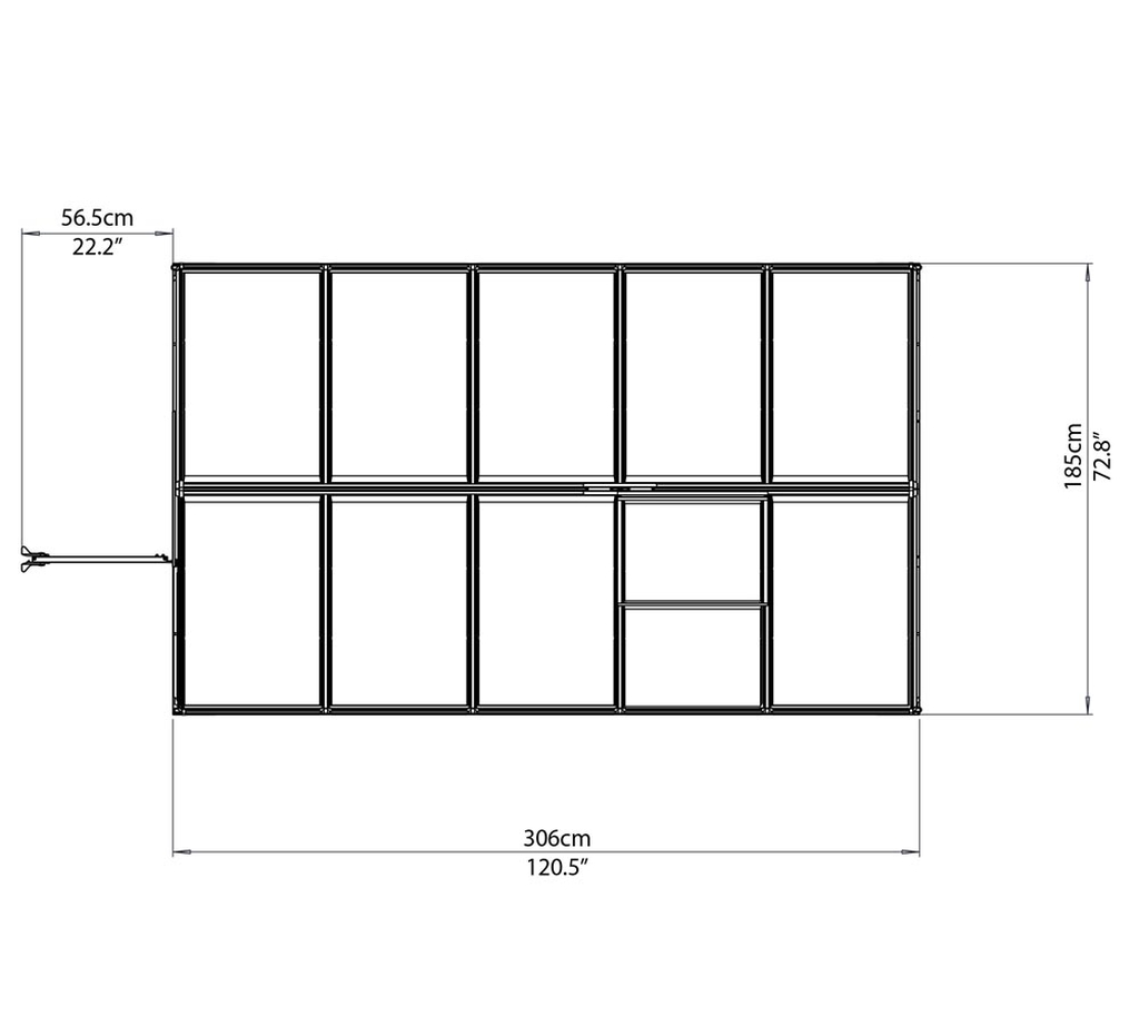 Szklarnia ma 185 cm szerokości, 306 cm długości oraz 208 cm wysokości całkowitej. To oznacza, że wewnątrz bez problemu zmieścisz zarówno niskie sadzonki, jak i wysokie rośliny, np. pomidory czy ogórki. Ścianki boczne o wysokości 124 cm gwarantują komfort pracy i pozwalają na pełne wykorzystanie przestrzeni.