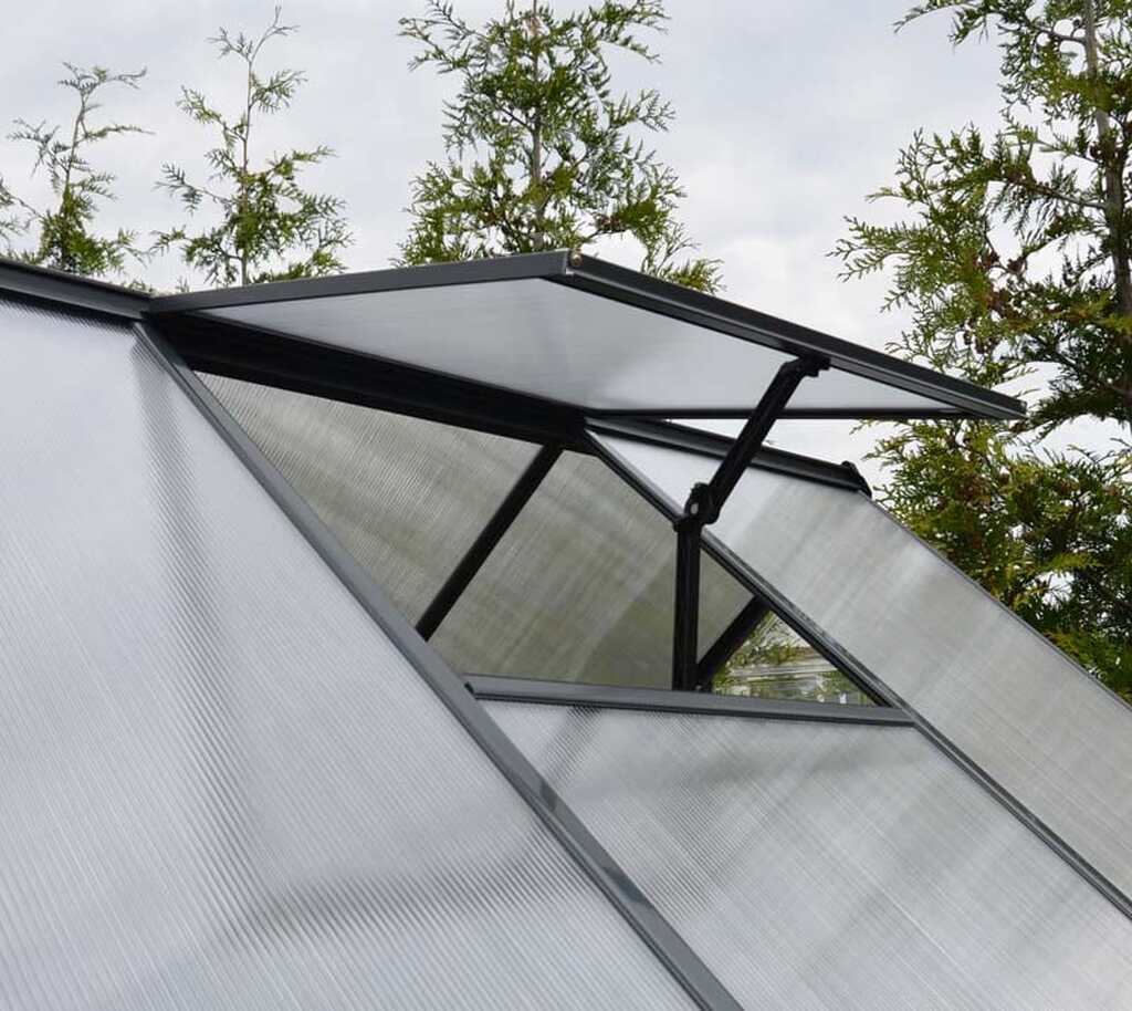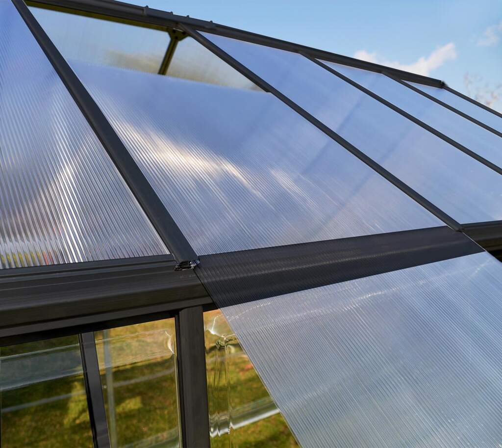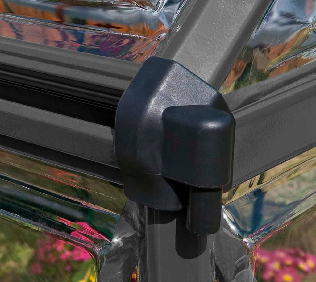 Stelaż szklarni Hybrid wykonano z odpornego na rdzę aluminium. Malowanie proszkowe w kolorze antracytu nadaje jej elegancki, minimalistyczny wygląd, który wkomponuje się zarówno w nowoczesny, jak i tradycyjny ogród. To konstrukcja zaprojektowana tak, aby służyła Ci przez długie lata bez dodatkowej konserwacji.