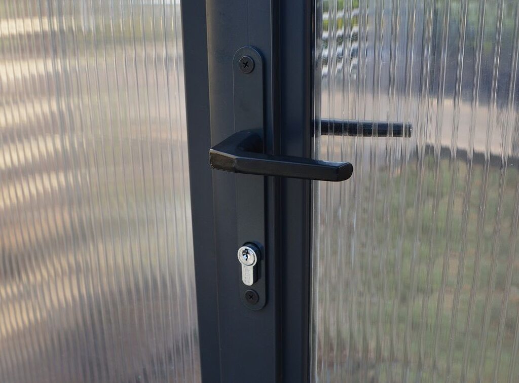 Do wnętrza szklarni prowadzą szerokie drzwi o wymiarach 188 × 80 cm z klamką i zamkiem, co zwiększa bezpieczeństwo i chroni rośliny przed nieproszonymi gośćmi. Niski próg ułatwia wjazd taczką lub wózkiem, a także wygodne wnoszenie donic czy skrzynek z rozsady.