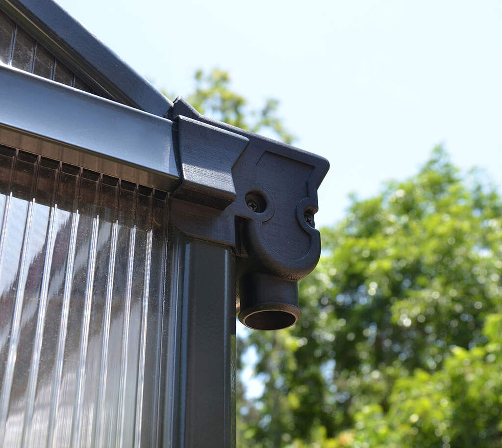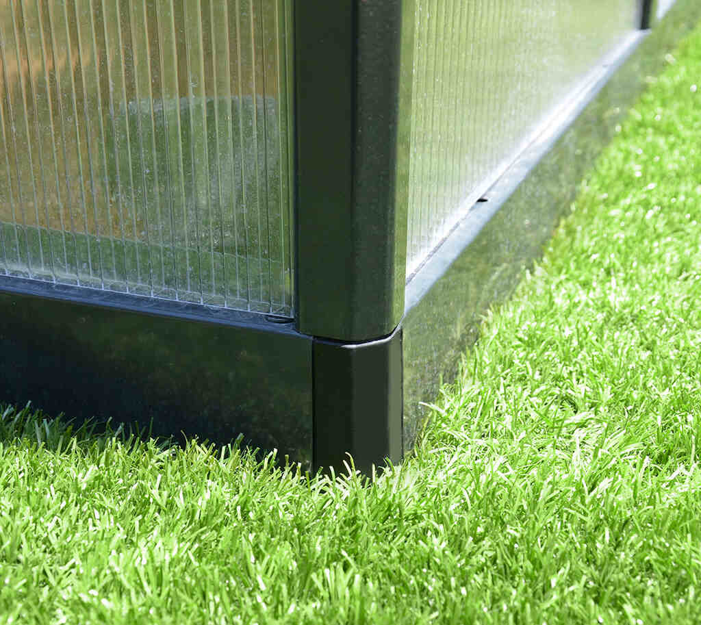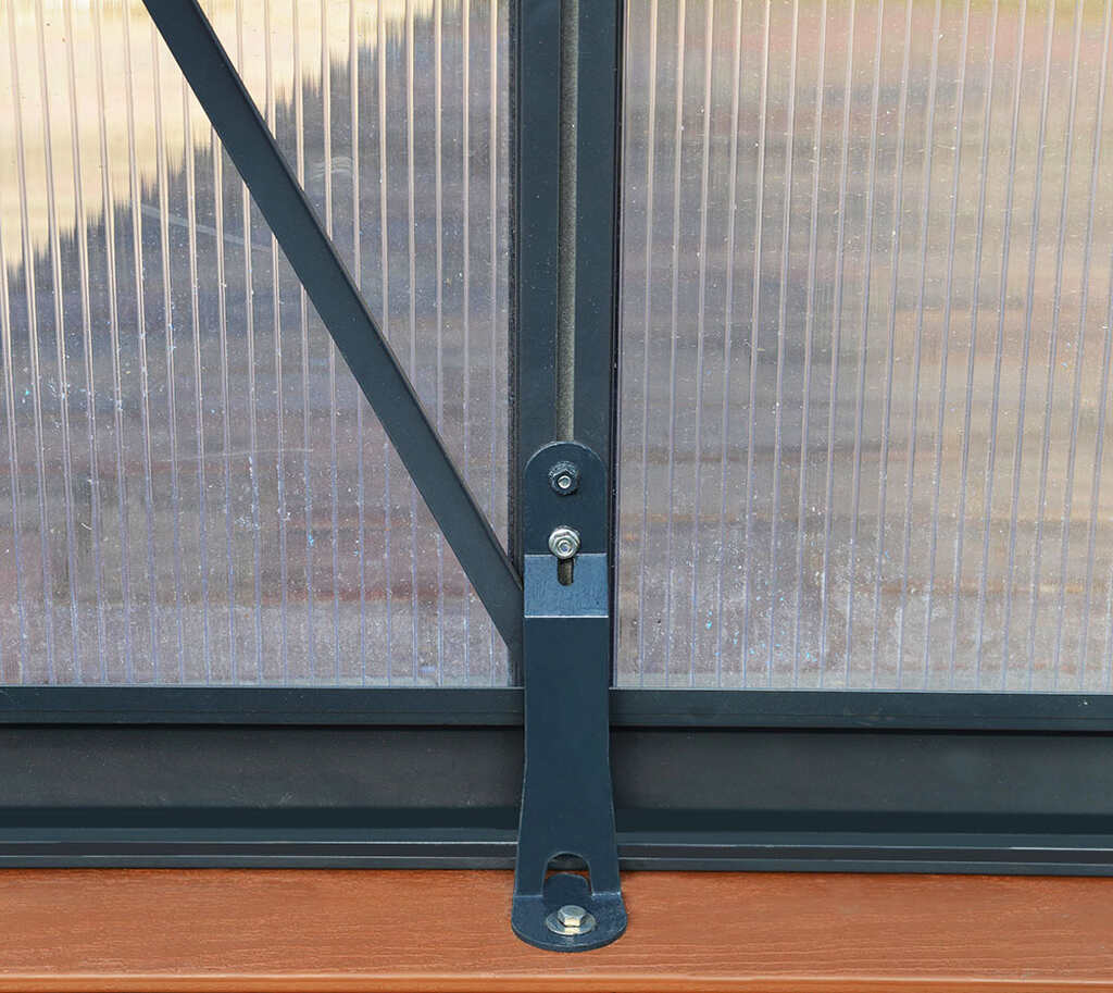 Rama wykonana z aluminium odpornego na rdzę w modnym kolorze antracytowym prezentuje się elegancko i nowocześnie. Zastosowanie dodatkowych wzmocnień szczytowych i narożnych sprawia, że konstrukcja pozostaje stabilna nawet przy silnym wietrze o prędkości do 100 km/h. To jedna z najtrwalszych szklarni na rynku – przystosowana do obciążenia śniegiem aż do 100 kg/m².