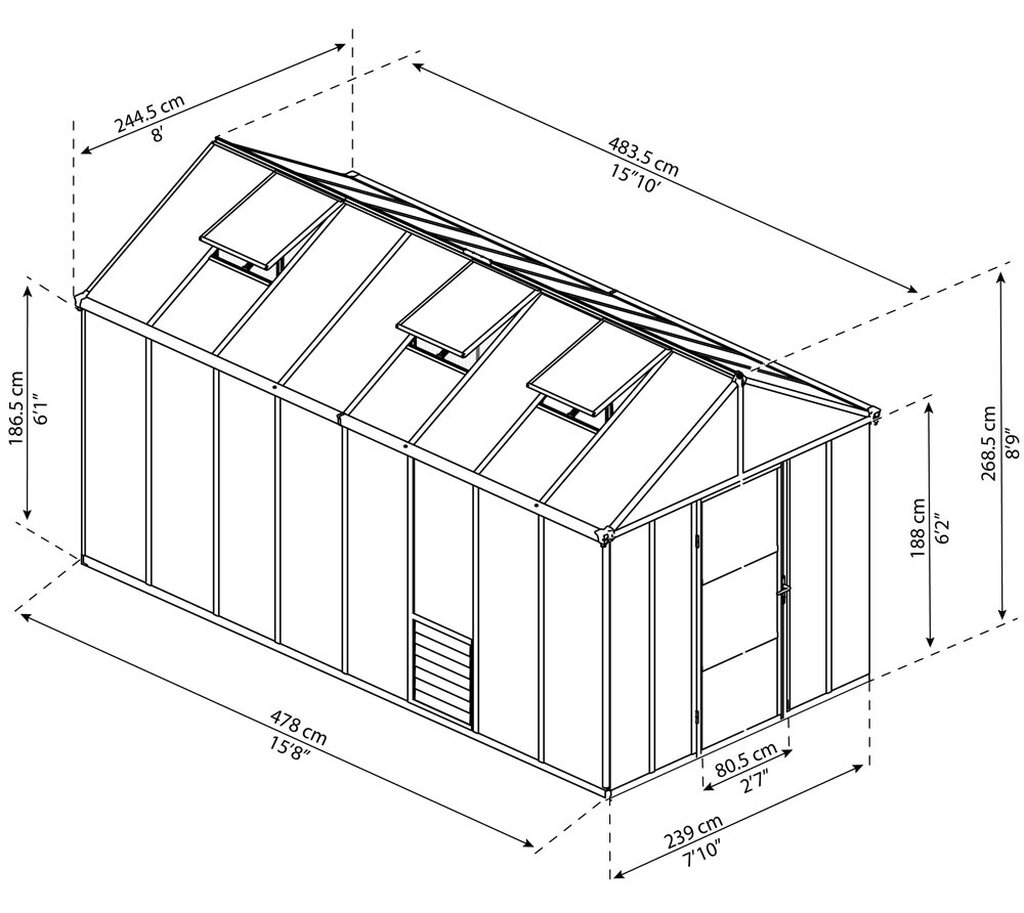 Model Glory 2,45 × 4,83 m to przestrzeń o powierzchni aż 11,8 m², pozwalająca na swobodną uprawę wielu gatunków roślin jednocześnie. Wysokie ścianki boczne o wysokości 186 cm oraz szczytowa wysokość 268 cm tworzą imponującą przestrzeń, w której można bez trudu poruszać się na stojąco, ustawiać wysokie regały, a nawet prowadzić uprawy pomidorów czy ogórków na podporach. Taka wysokość daje też możliwość montażu systemu nawadniania lub oświetlenia, co czyni szklarnię wyjątkowo praktyczną.
