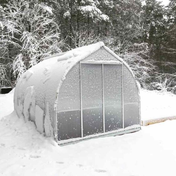 Zaokrąglona ścianka boczna i charakterystyczny “bell-shape” tej szklarni korzystnie wpływają na stabilność konstrukcji i wygląd. Kształt dzwonu pozwala śniegowi łatwo ześlizgiwać się z dachu, a także redukuje wpływ wiatru — co czyni ten model solidną inwestycją na lata.