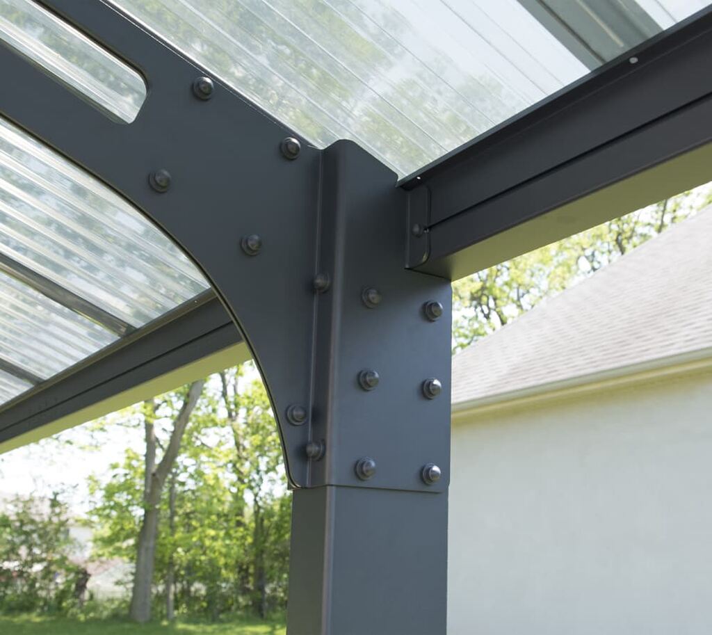 Rama wiaty Arizona została wykonana z malowanego proszkowo aluminium w eleganckim kolorze antracytowym. Dzięki temu jest całkowicie odporna na rdzę i nie wymaga konserwacji. Wysokiej jakości stal ocynkowana w łącznikach gwarantuje doskonałą stabilność oraz odporność na uszkodzenia mechaniczne.