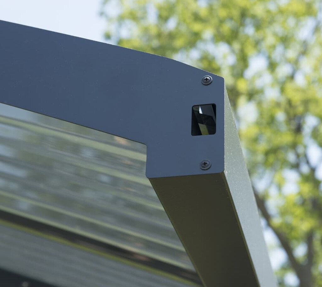Dach wykonano z polikarbonu litego o grubości 0,7 mm, który stanowi gwarancję wieloletniej trwałości. Panele są odporne na promieniowanie UV – nie żółkną, nie pękają i nie matowieją, dzięki czemu wiata wygląda jak nowa przez długie lata. Przepuszczalność światła na poziomie 10% zapewnia idealny balans – wnętrze jest jasne, a jednocześnie skutecznie chronione przed intensywnym słońcem.